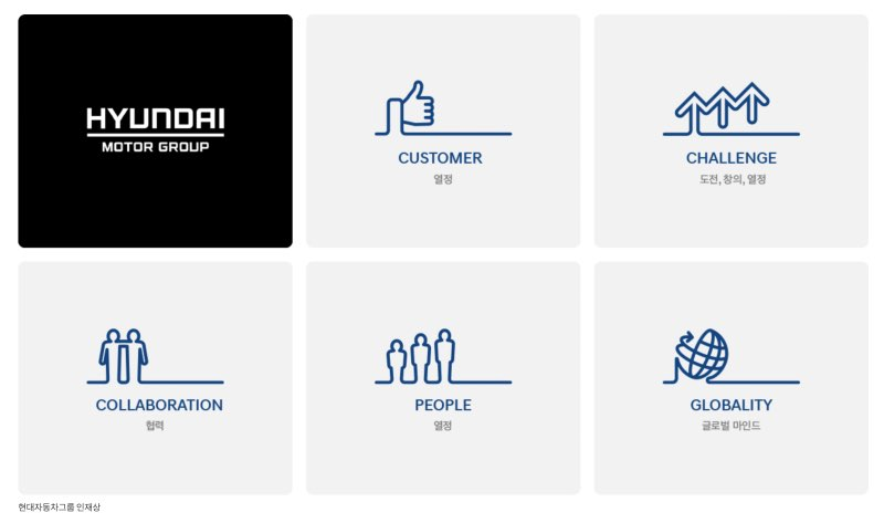 취업을 준비하면서 가장 중요한 과정 중 하나가 바로 지원하고자 하는 회사의 인재상을 확인하고 숙지하는 것입니다. 이 내용은 자기소개서뿐만 아니라 면접의 질문과 대답에 큰 도움이 되기 때문입니다. 현대자동차의 인재상을 미리 확인하고 해당 내용에 맞는 자기소개서를 작성할 수 있도록 해 봅시다.